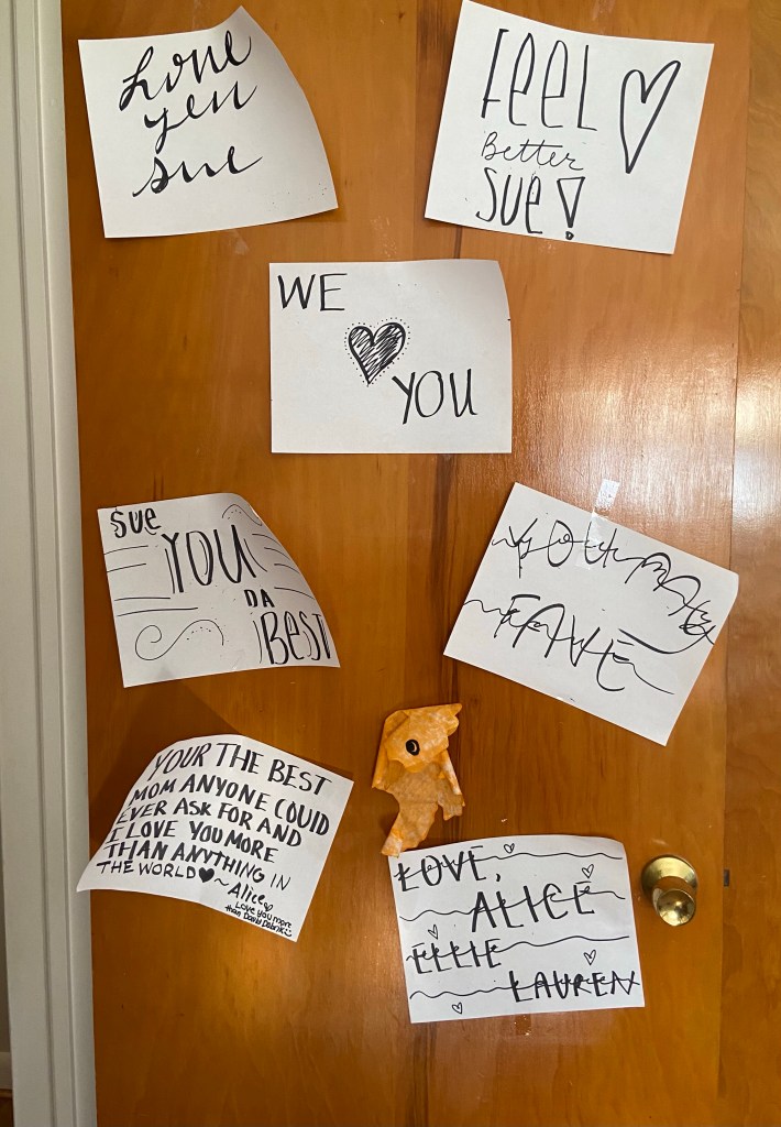 My energy was low and I had trouble concentrating. I would prioritize a few tasks for the day and at least get those items done. I was still working full-time through all of this. My house felt like a huge cluttered mess. I would rest and my 16-year-old daughter would go about her activities. One day, she and her friends wrote “Get Well” signs on my bedroom door. Two years later I still have them hanging up. I can’t quite bring myself to take them down (pictured above).