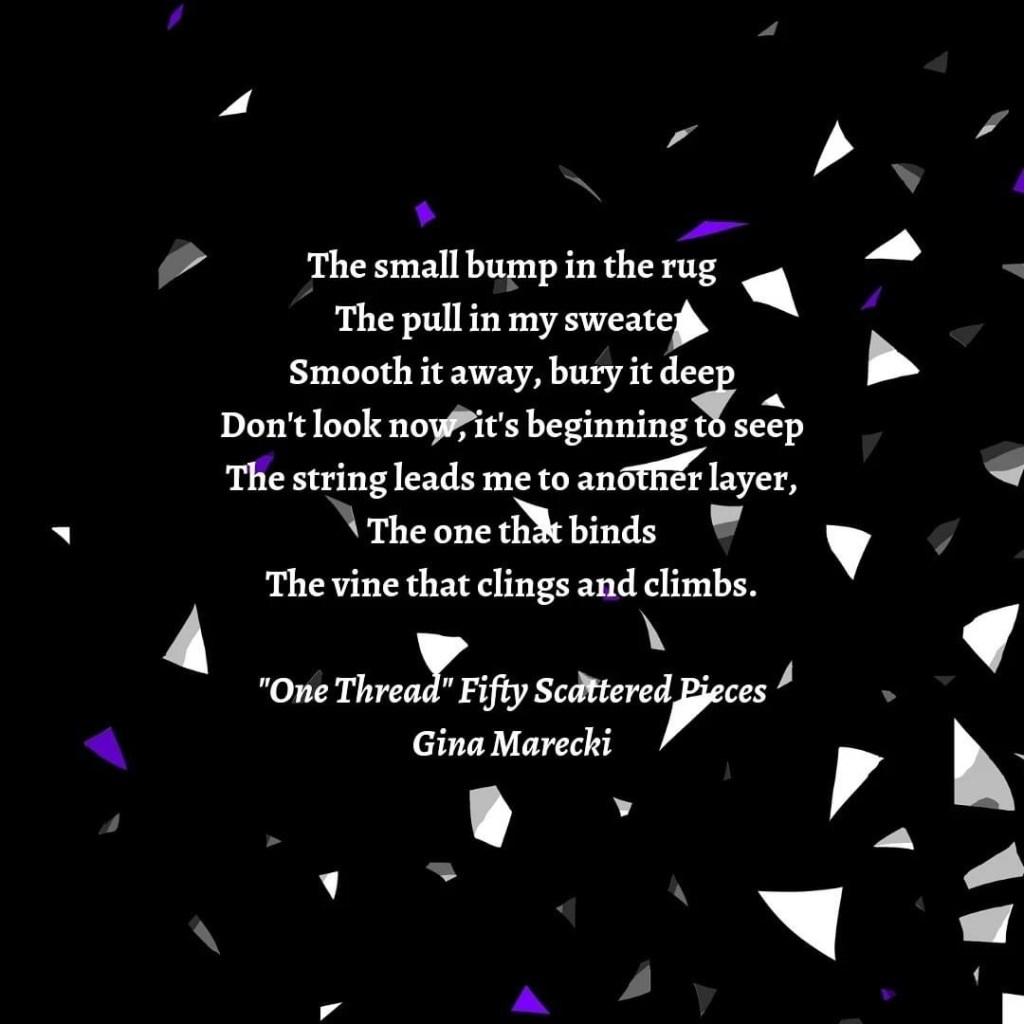 Checkout Gina’s remarkable book of poetry: Fifty Scattered Pieces . Here’s a sample – One Thread.