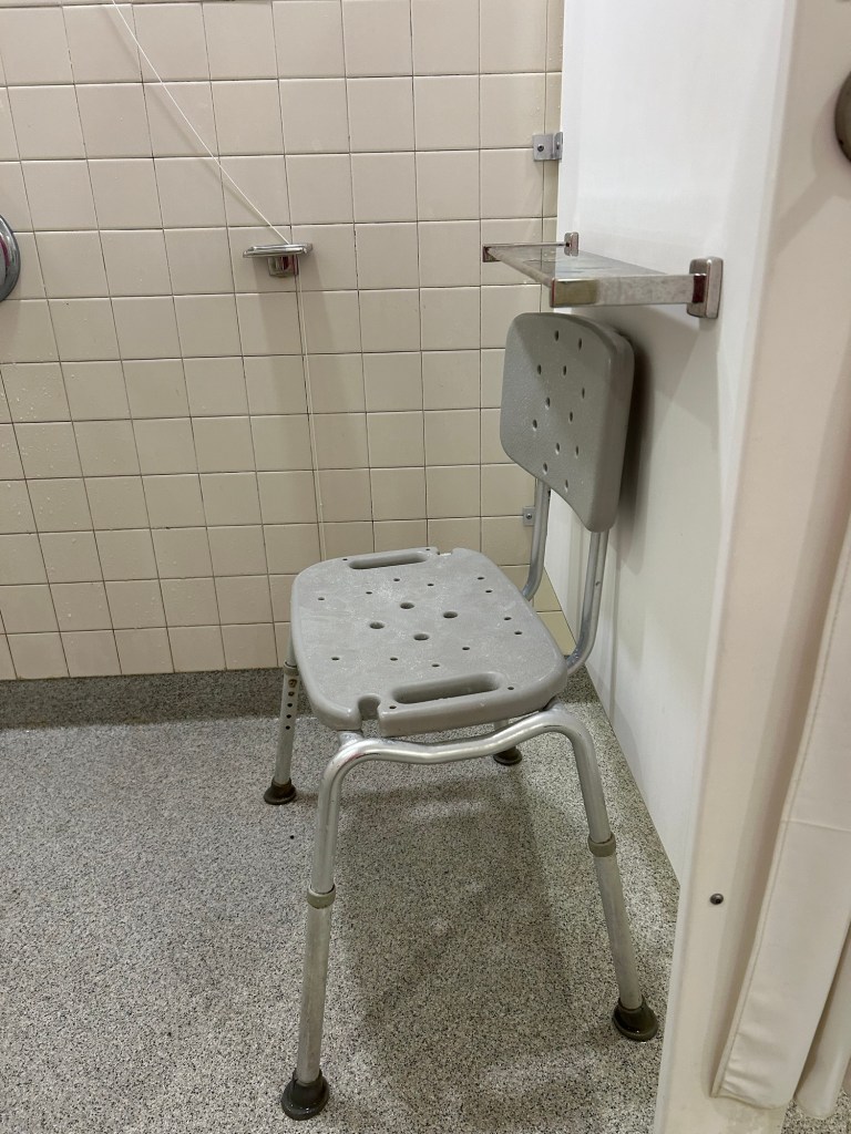 Once again, using the handicap shower for me is similar to handicap parking. Some days I need it, some days I don’t. And honestly, the handicap stall there isn’t overly helpful. There’s a seat and a hand-held shower if you want to use it, but no grab bars, which are essential. There’s a shelf someone may inadvertently use as a grab bar which is not a safe or secure option. There’s a free-standing chair, but no grab bar to help one balance or move up and down from the chair. Luckily, after class this day, I was fine to use a regular shower stall.